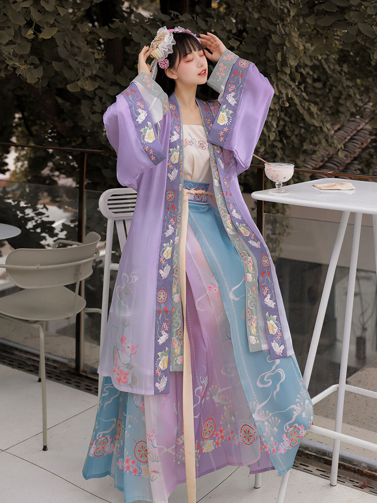 年轻女性偏爱齐胸襦裙的青春活力感。春秋时节,可在襦裙外加一件半臂或短褙子,既增加了实用性,又丰富了造型层次。选择枫叶红、银杏黄等季节性色彩,与自然秋色相映成趣。