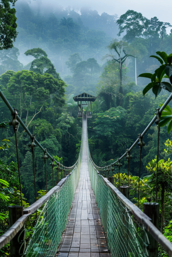 桥身由钢索与木板构成,全长近百米,横跨深逾60米的峡谷。行走其上,山风穿谷而过,桥面轻摇如舟,脚下溪流奔涌、古树参天,每一步都考验着勇气与平衡感。攻略贴士: